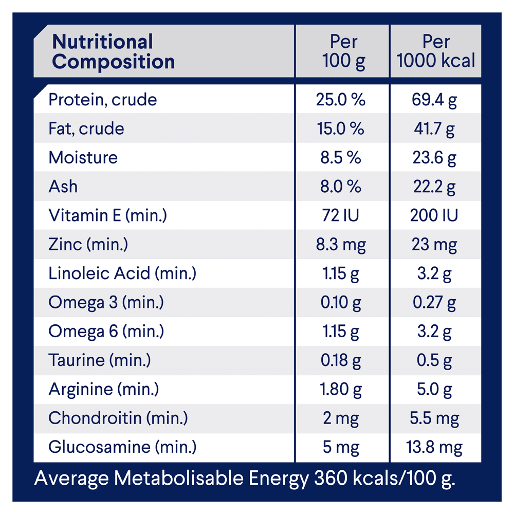 Average Metabolisable Energy: 360 kcals/100 g