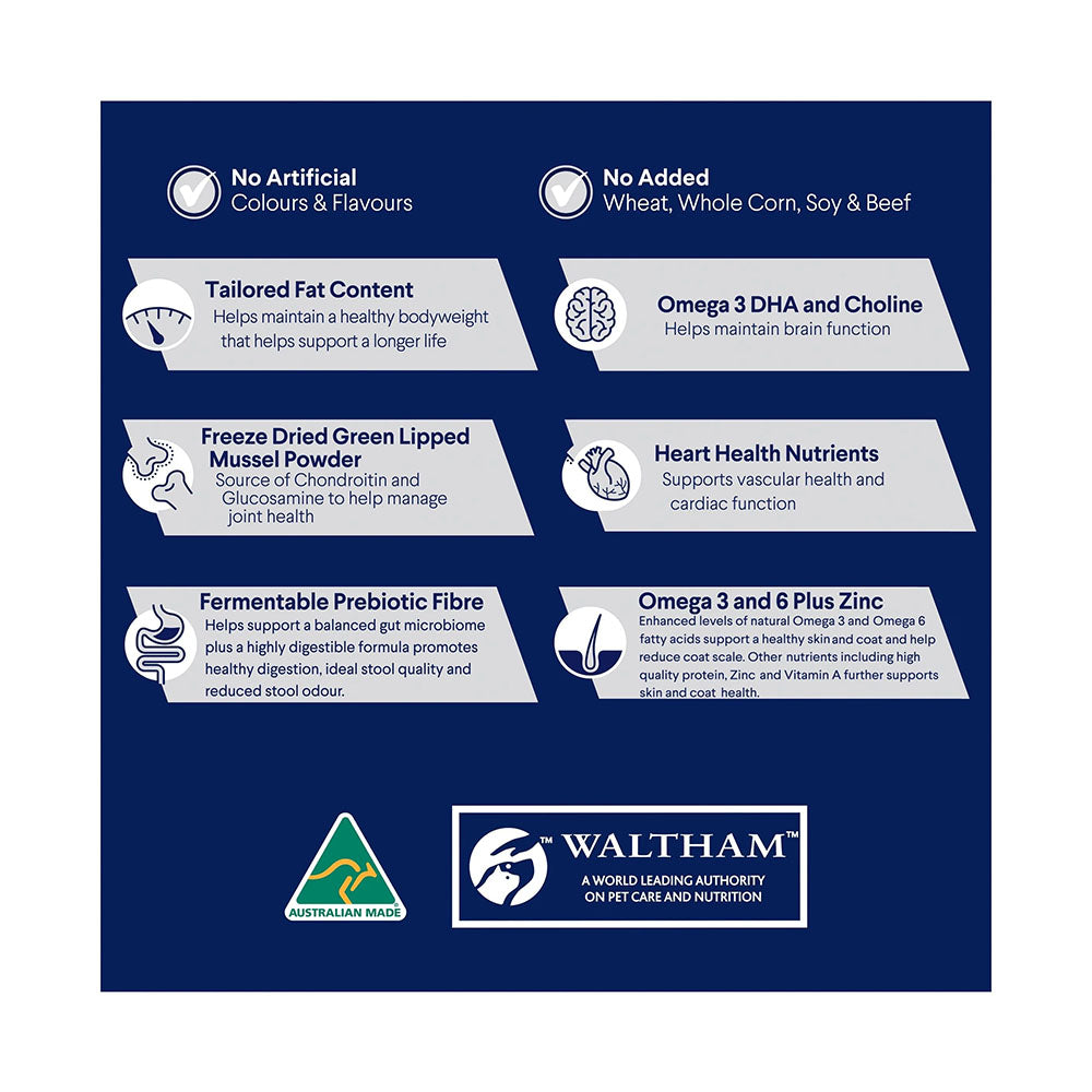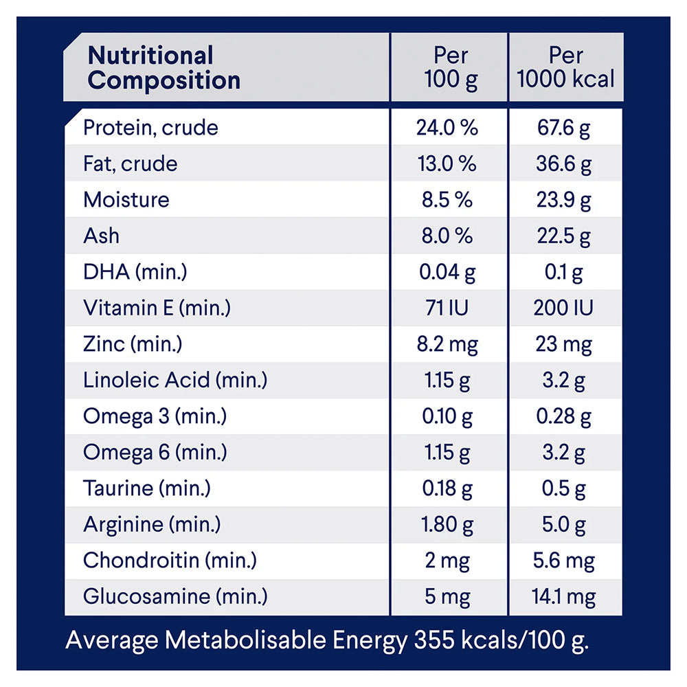 - Joint Support: Enriched with glucosamine and chondroitin to support joint health and mobility in ageing dogs.