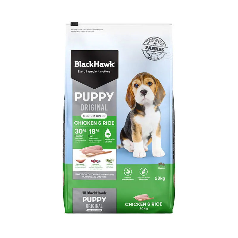 Support your medium breed puppy's growth and development with Black Hawk Original Puppy Medium Breed Chicken & Rice. This premium Australian-made formula is crafted by pet nutritionists and veterinarians to provide a balanced diet that helps your puppy thrive.