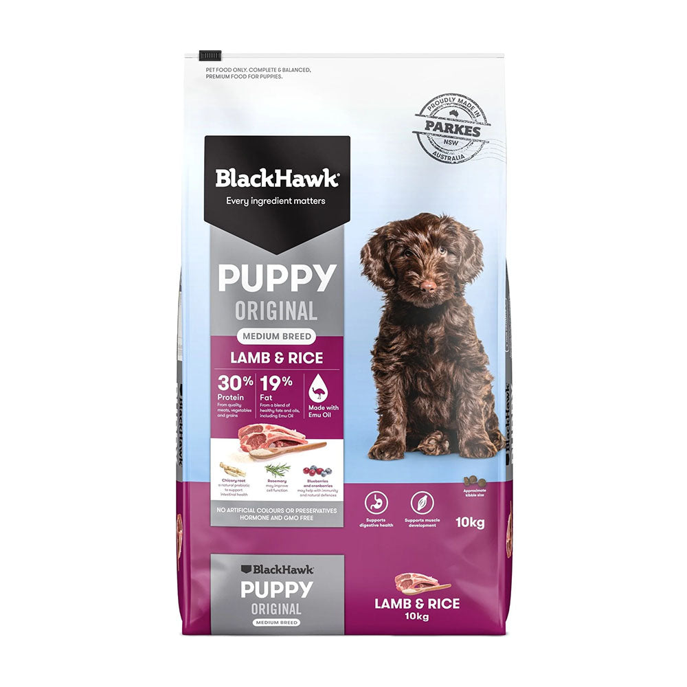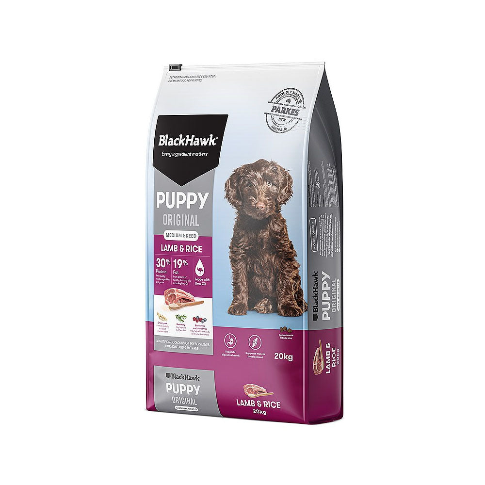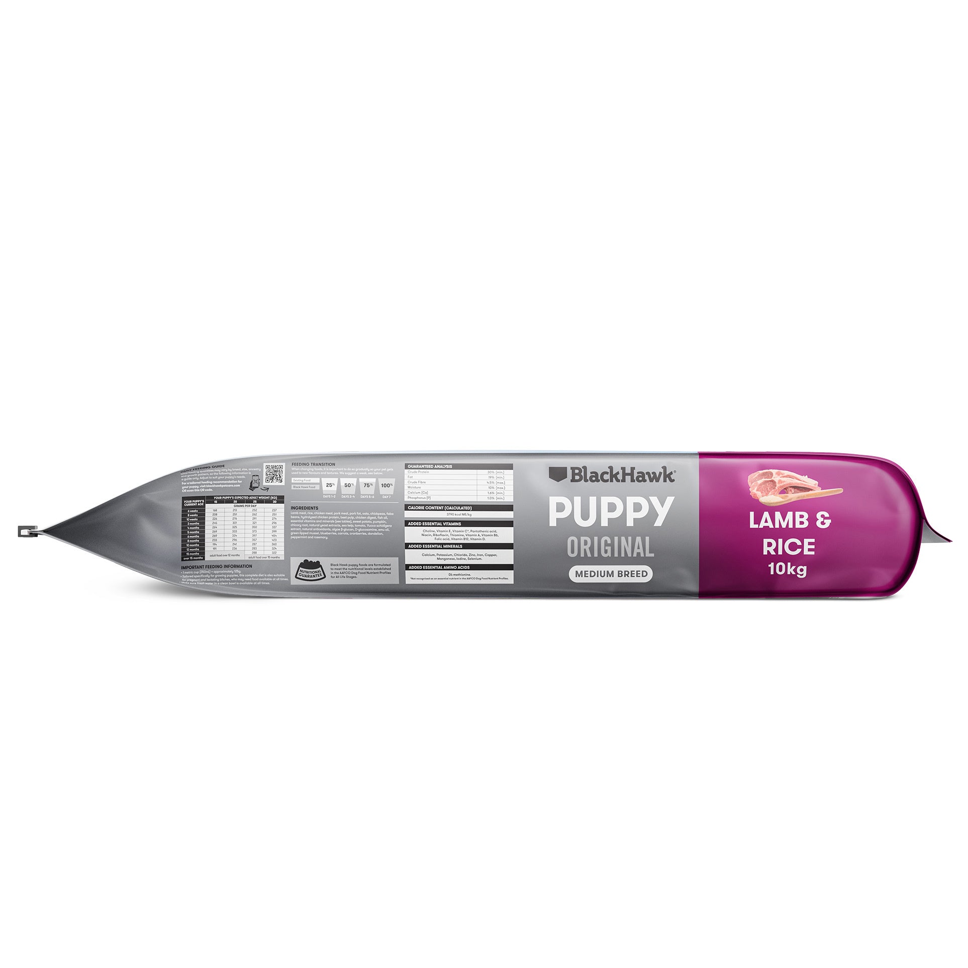 Black Hawk Original Lamb & Rice Medium Breed Puppy kibble is sized to suit and encourage healthier eating and chewing at mealtimes.