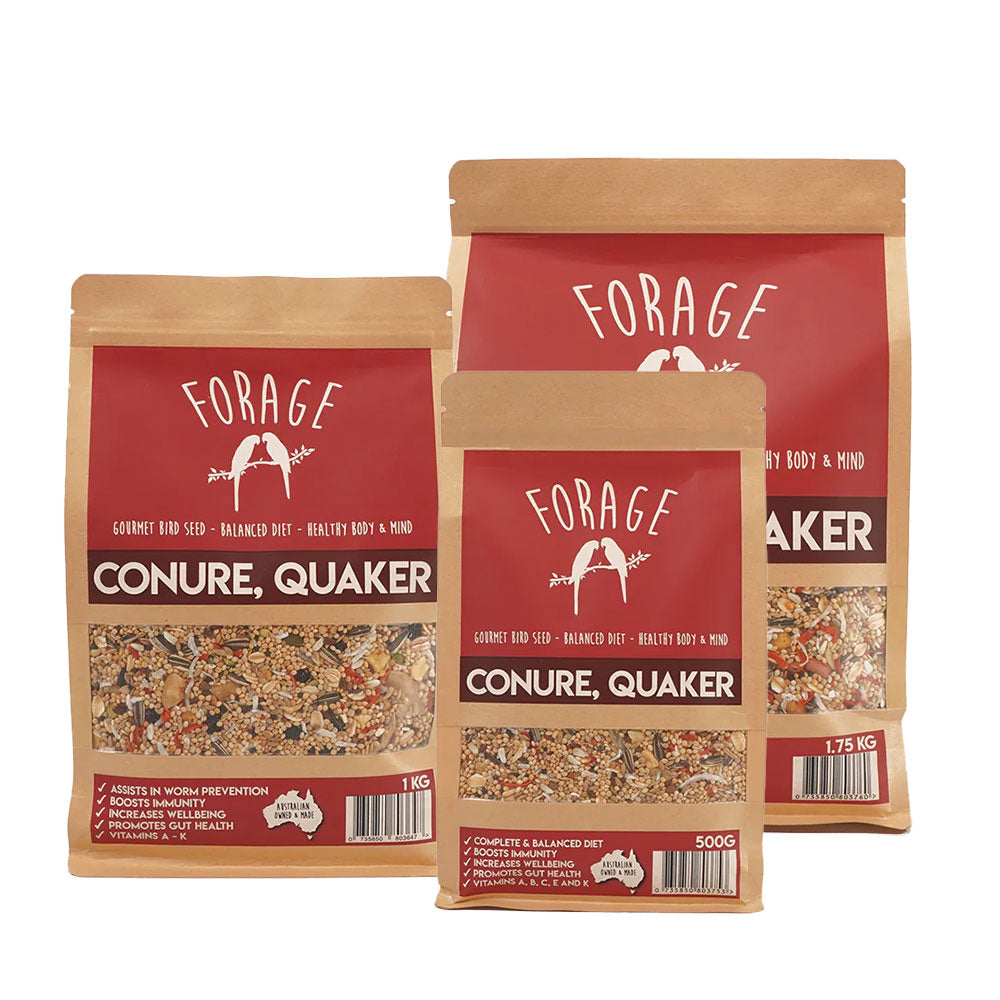 Give your feathered friends the nutrition they deserve with the FORAGE Gourmet Bird Seed: Conure & Quaker Specialty Blend. Carefully crafted to meet the dietary needs of Conures and Quaker parrots, this premium blend is packed with wholesome, high-quality ingredients to promote health, vitality, and happiness in your birds.