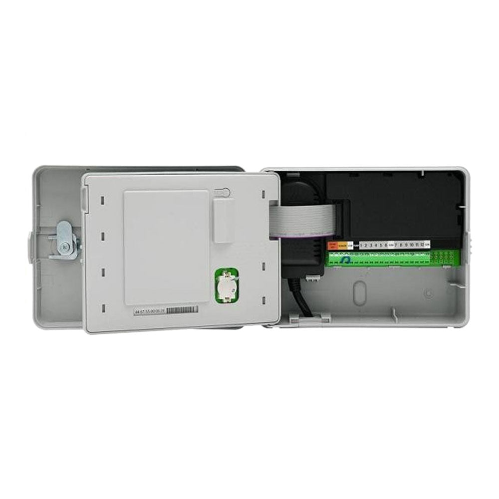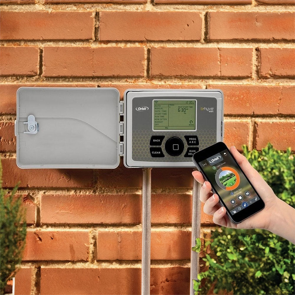 The B-hyve Smart Indoor/Outdoor Irrigation Controller for underground sprinkler systems provides two convenient ways to manage your watering: a waterproof, wall-mounted control panel suitable for both indoor and outdoor installation, and an intuitive smartphone app that allows control from anywhere. With Wi-Fi and Bluetooth connectivity, you can set zones, schedules, and receive updates directly from the smart controller.