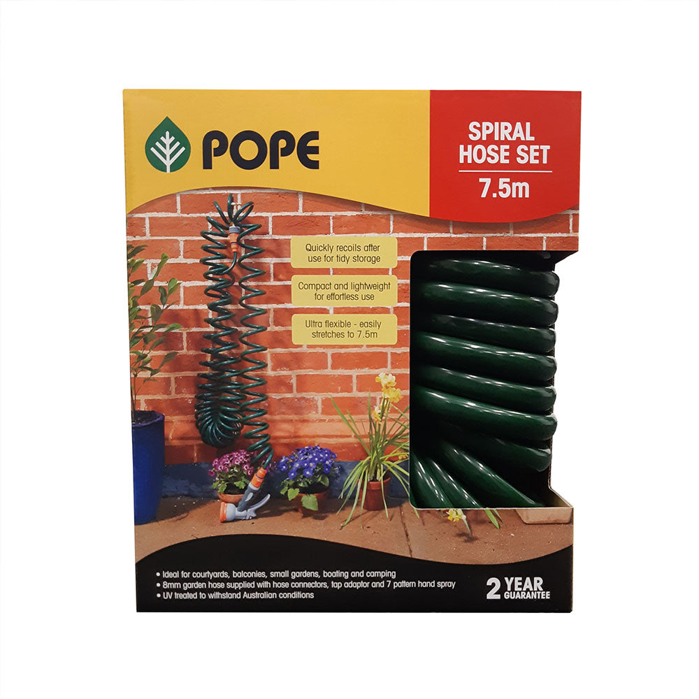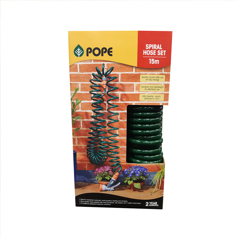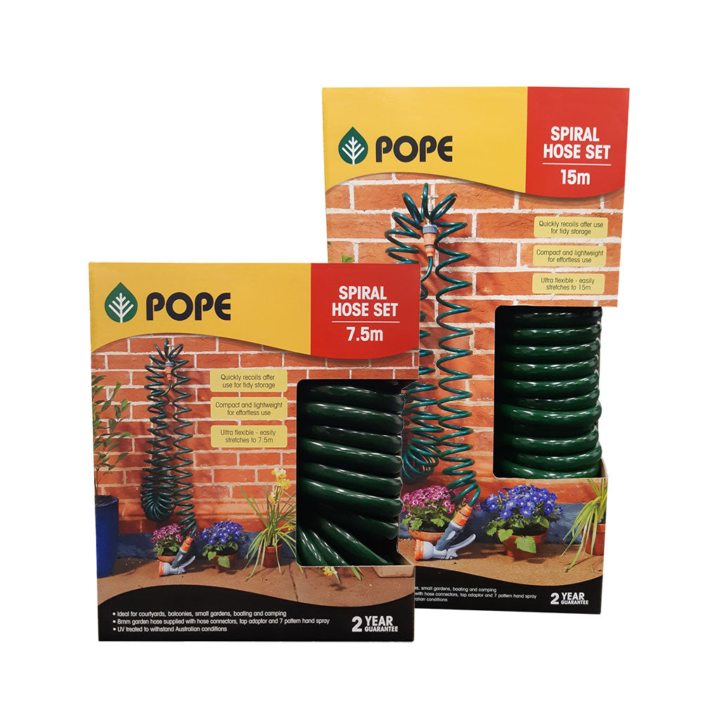 POPE 8mm Spiral Hose Set is a compact and ultra-flexible watering solution, ideal for courtyards, balconies, small gardens, boating, and camping. Its innovative design allows the hose to expand to either 7.5 metres or 15 metres, providing ample reach for various watering tasks.