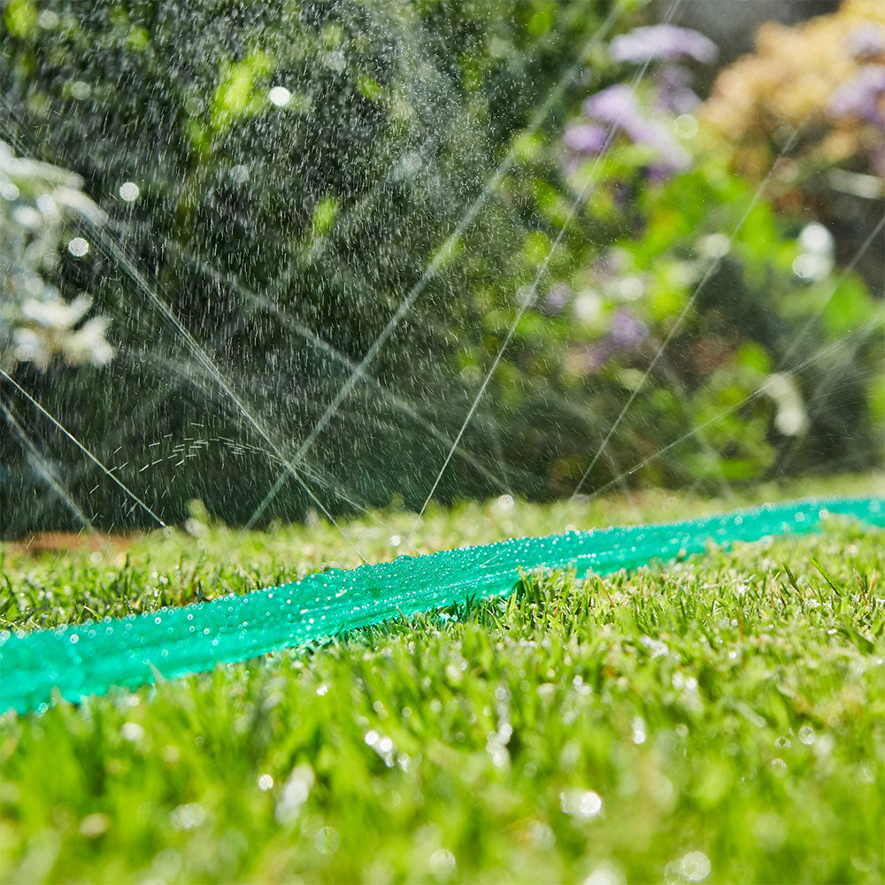 Featuring wide-based fins on either side, this hose prevents kinking and twisting, ensuring consistent water flow. The spray pattern can be positioned upwards for gentle sprinkling or downwards for deep root soaking. Equipped with a snap-on connector and adaptor, it easily connects to standard garden hoses and can be extended up to 30 metres for broader coverage.