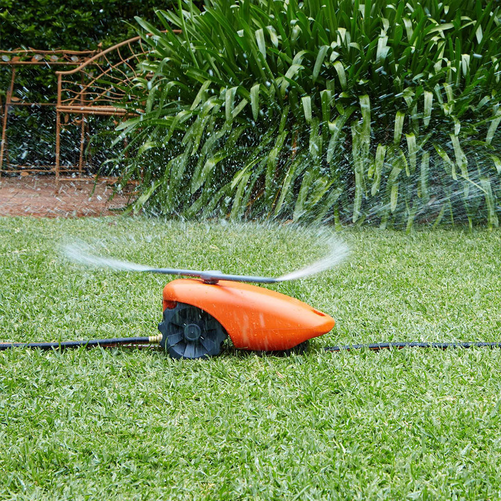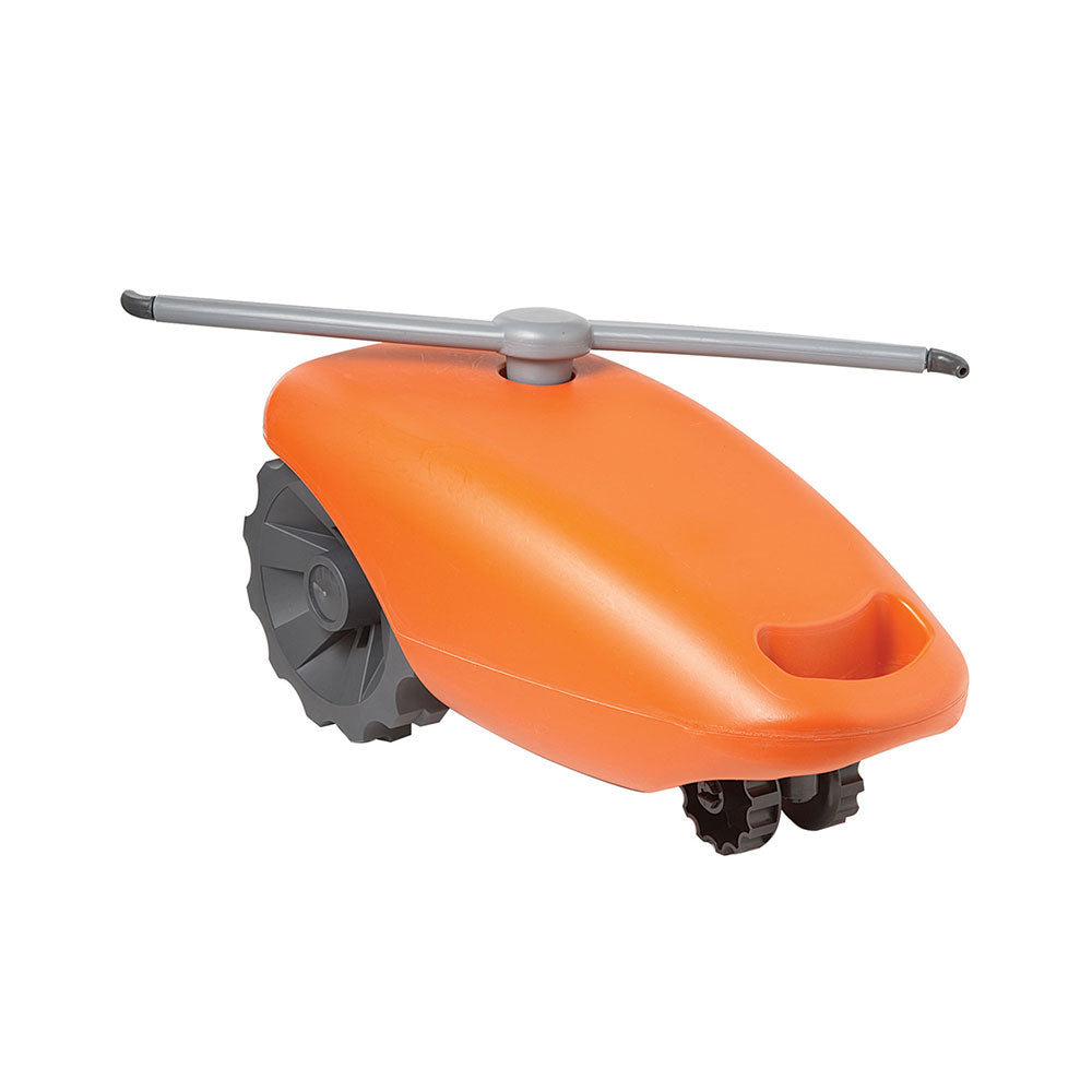 - Self-propelled mechanism follows the garden hose for autonomous operation