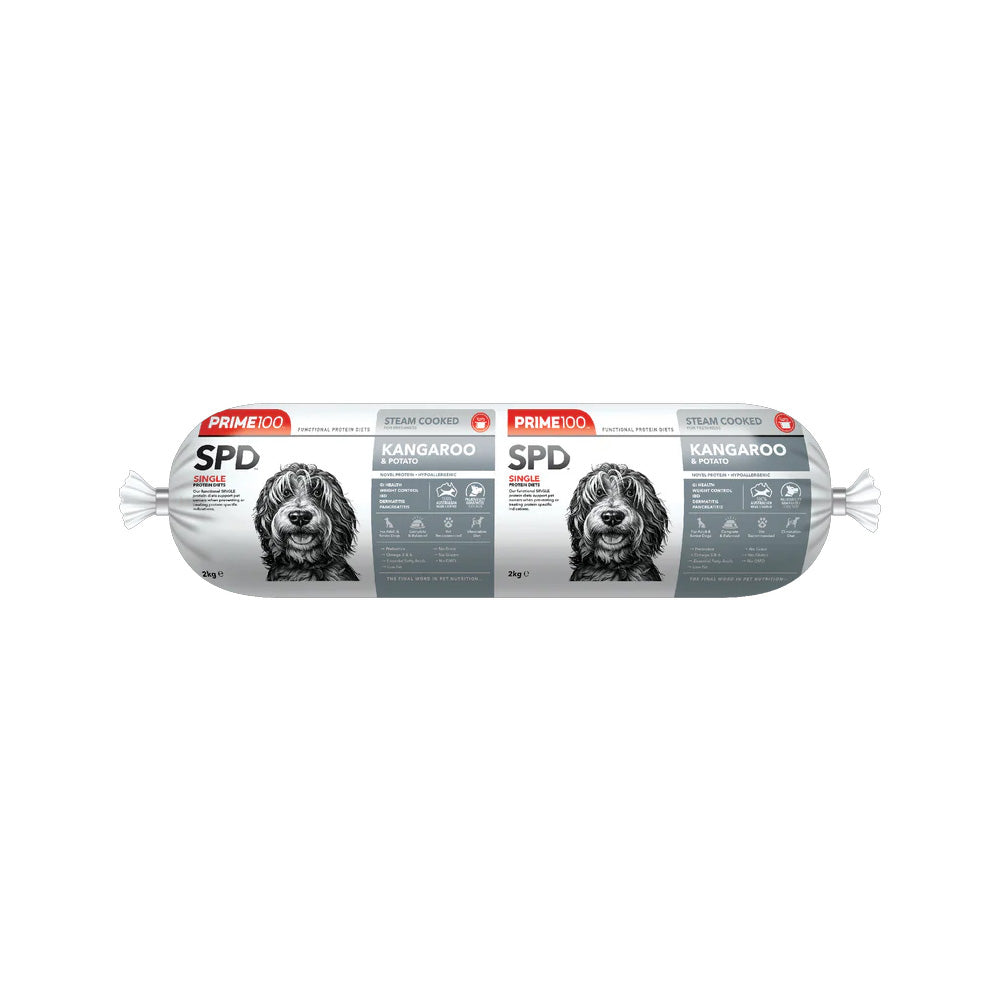 Provide your dog with a premium, hypoallergenic diet using the Prime100 SPD™ Fresh Roll Kangaroo & Potato. This single-protein formula is crafted to support dogs with food sensitivities, skin allergies, or digestive issues, ensuring they receive balanced nutrition for optimal health.