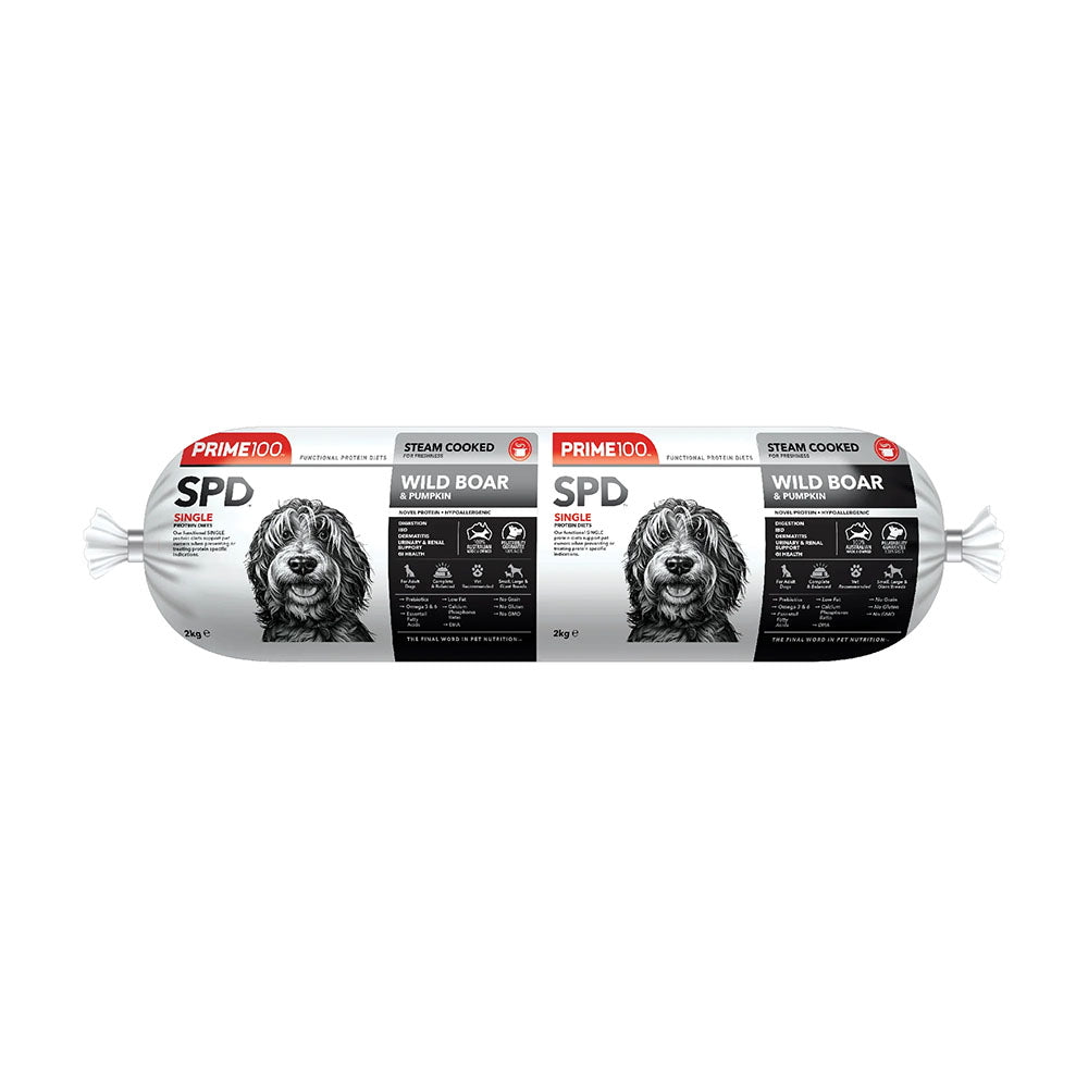 AAFCO Statement: Prime100 SPD™ Wild Boar & Pumpkin cooked roll meets the nutritional levels established by the AAFCO Dog Food Nutrient Profiles for adult dogs.
