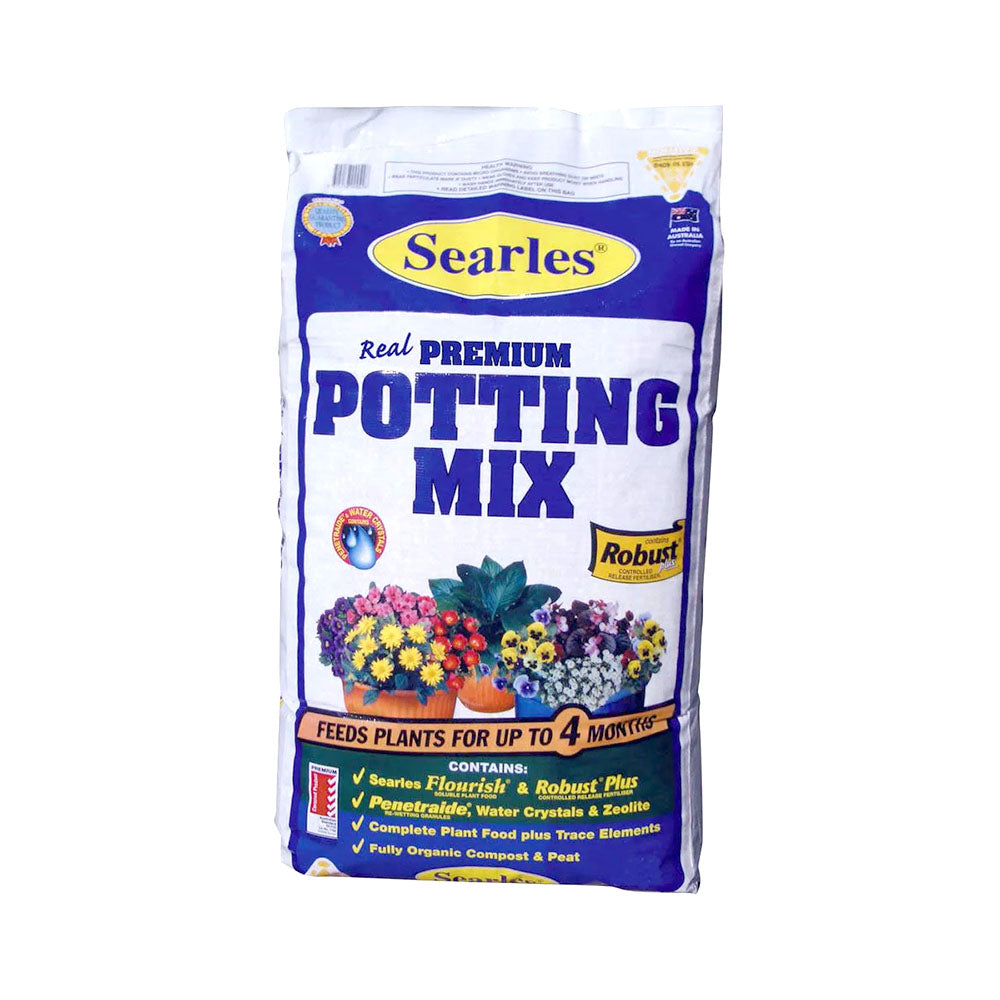 Searles Premium Potting Mix is a top-tier potting medium crafted from a refined blend of superior ingredients. This mix includes real organic compost and humus, serving as nutrient reservoirs that safeguard nutrients from leaching while making them available to plants as needed.
